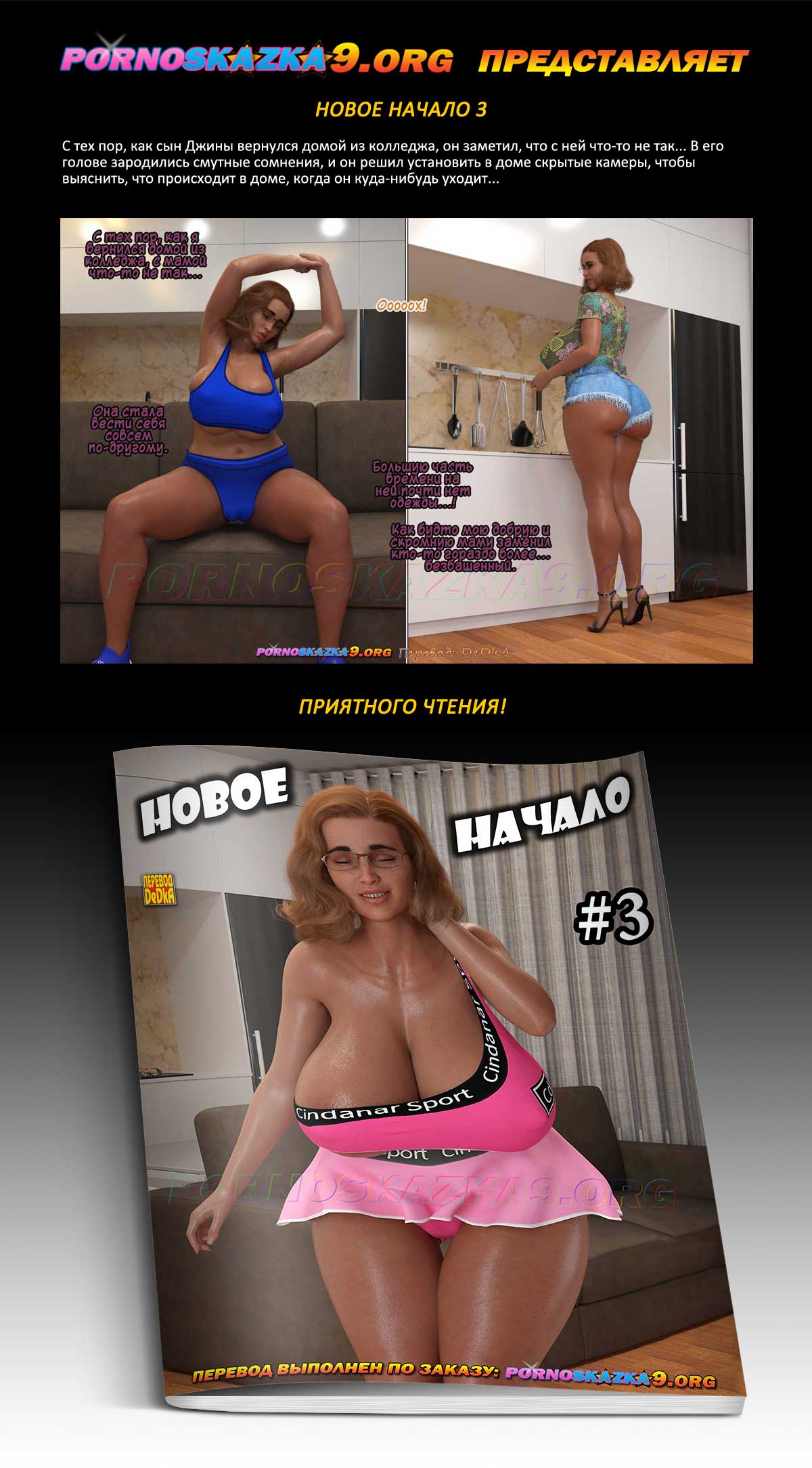 Порно комикс «Новое начало. Часть 3.» С тех пор, как сын Джины вернулся домой из колледжа, он заметил, что с ней что-то не так… В его голове зародились смутные сомнения, и он решил установить в доме скрытые камеры, чтобы выяснить, что происходит в доме, когда он куда-нибудь уходит…